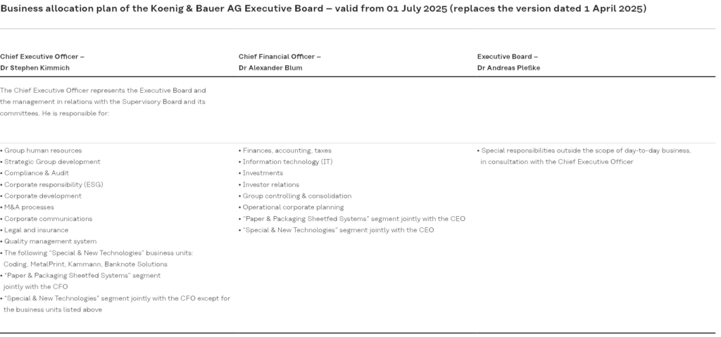 Koenig & Bauer AG is a public limited company (“Aktiengesellschaft”) under German law with a dual management structure. Its Executive Board consisted of three members as of 31 December 2025: