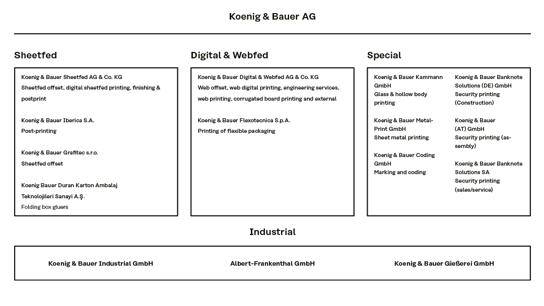 As shown in simplified form in the diagram setting out the 2025 Group structure, the production subsidiaries are allocated to the two segments P&P and S&T on the basis of their business activities. The domestic and foreign companies, which offer sales and service functions for several segments are allocated to the segments in accordance with their activities. Similarly, the business units defined as production service providers (“Industrial”) are allocated to the two segments on the basis of their activities. Industrial acts as a production service provider within the Group, manufacturing high-precision components for printing presses in conjunction with other companies. It specialises in precision-machined large parts made of cast iron or steel, complex prismatic rotating parts, gears, curves, sheet metal assemblies, rollers, and the environmentally friendly coating of rotating parts. In addition, Industrial offers further services such as assembly, engineering, and logistics.