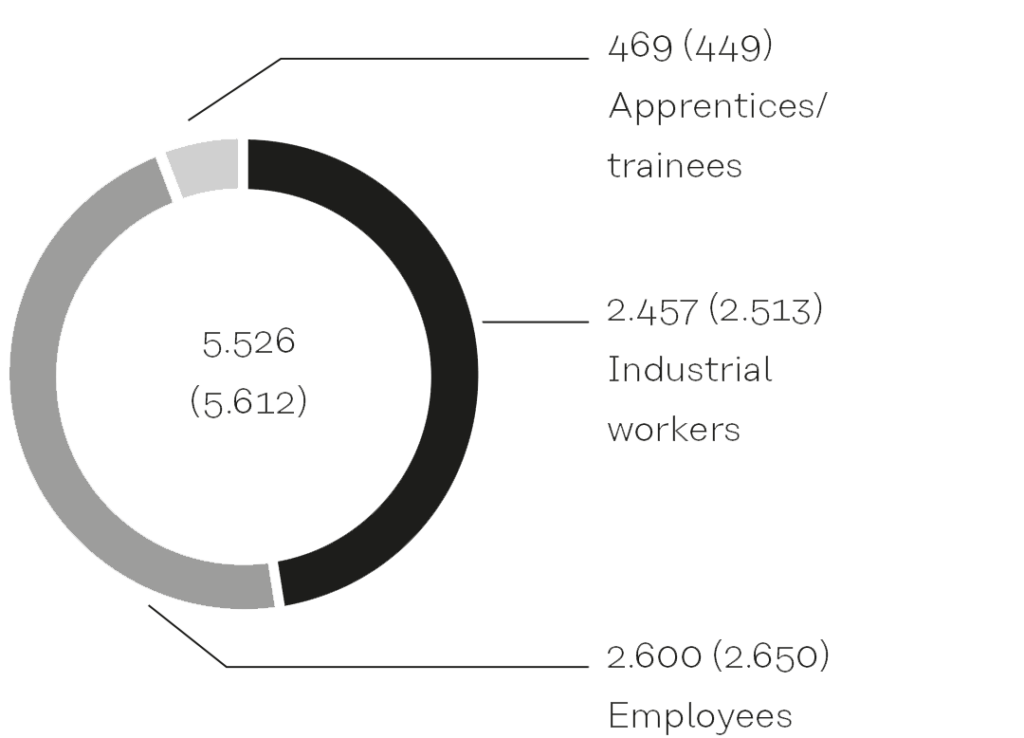 Since the launch of the “Spotlight” focus programme at the end of 2023, the number of employees has decreased by a total of 215. The total capacity adjustment of around 300 full-time equivalents (FTE) sought in the programme was achieved through a combination of personnel and structural measures. In addition to voluntary termination benefits, the reduction of the weekly working time from 40 to 35 hours in the addressed areas contributed significantly to achieving the capacity target while stabilising the core workforce. In addition measures included flexible working time instruments, voluntary salary waivers, and a targeted reduction in outstanding vacation entitlement. Due to their design and timing of implementation, these measures are gradually impacting the personnel cost structure. Due to capacity utilization factors, short-time working was used to a minor extent at three sites (previous year: five).